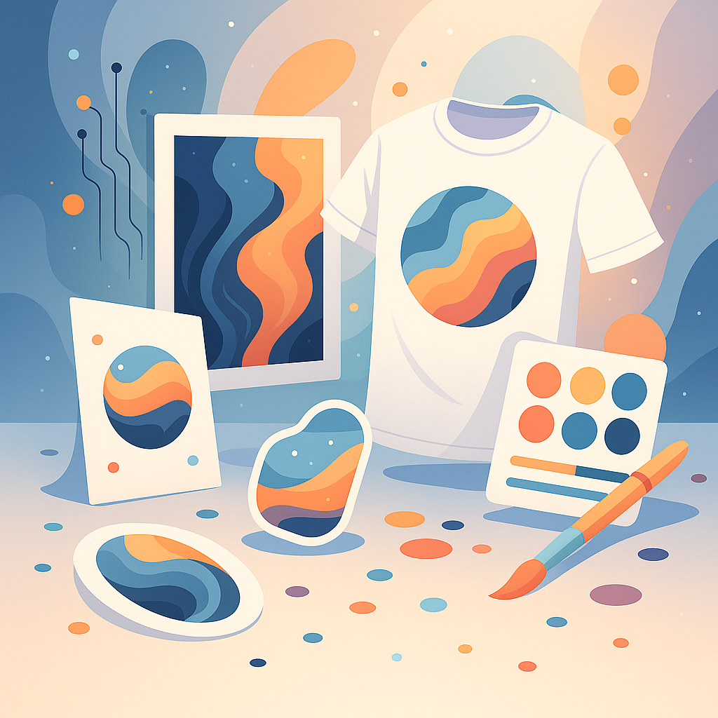 Obras visuales creadas con inteligencia artificial y aplicadas a productos únicos. Cada pieza es una síntesis de estética, narrativa y posibilidades impresas.